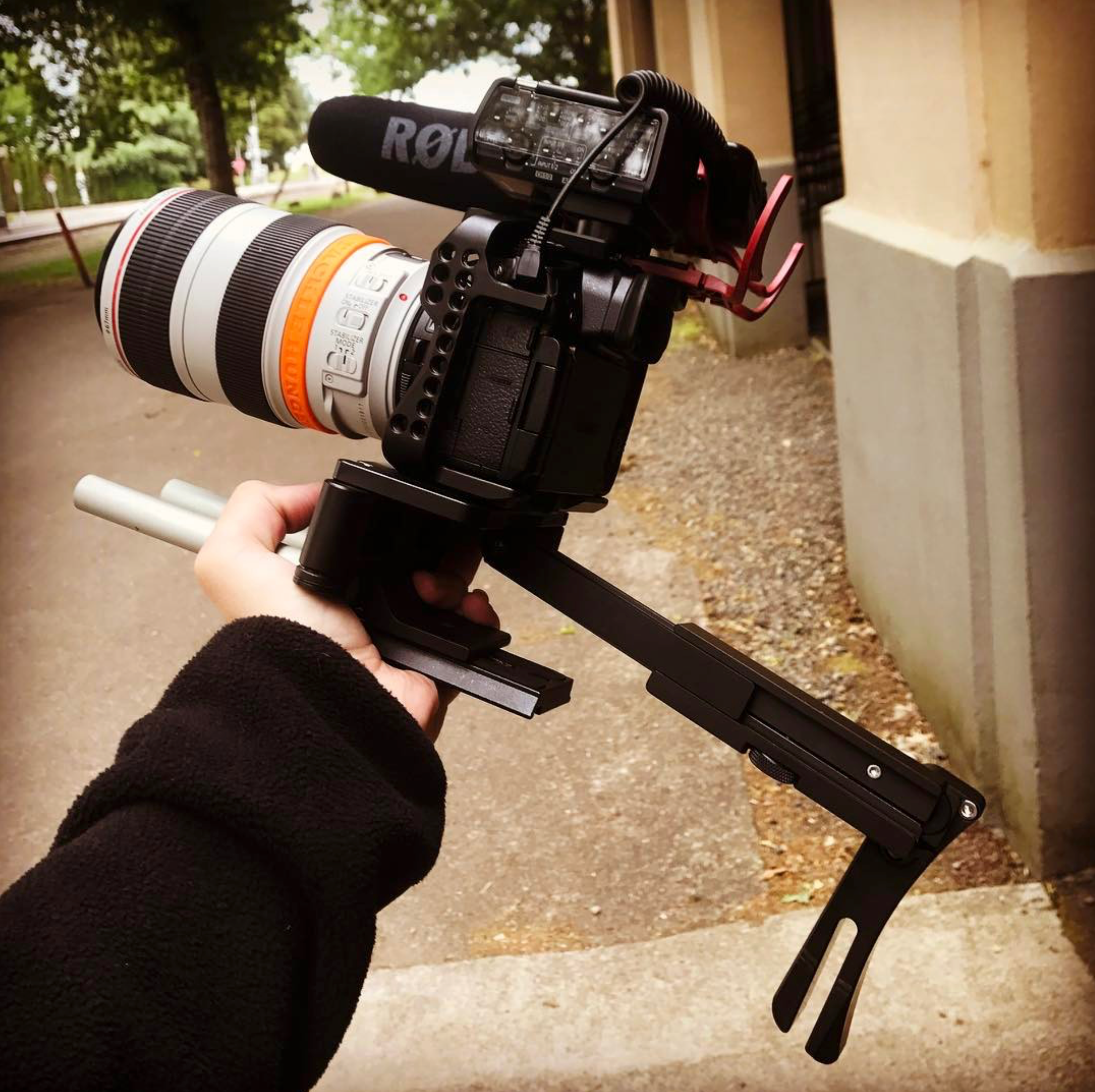 By using the belt groove on the shoulder piece, you can use the PocketRIG v2 like a monopod and achieve very stable shots without getting tired.